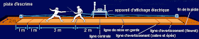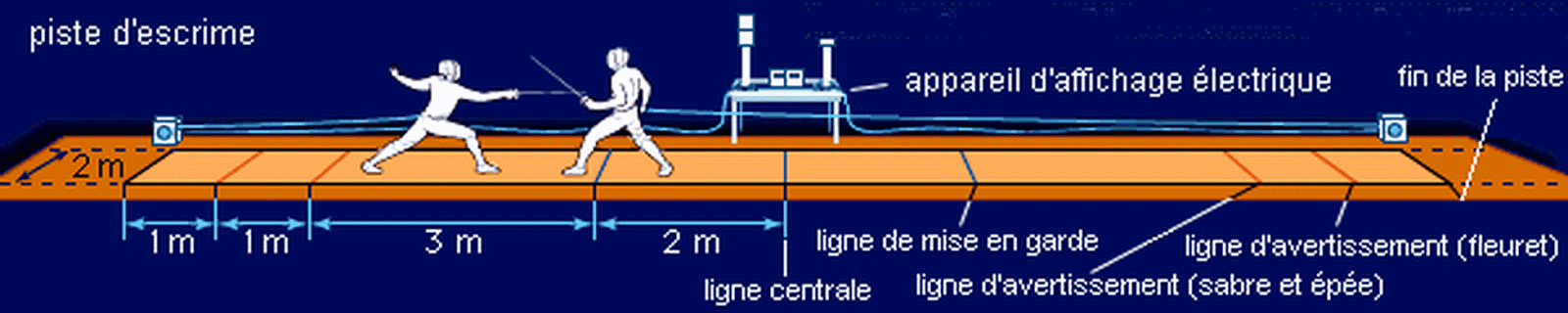 -Un match d’escrime est généralement arbitré. Le rôle de l’arbitre est de lancer et de stopper le combat, d’attribuer les touches, (de donner la phrase d’arme= explication de ce qui s’est passé avant la touche), et de sanctionner les différentes fautes. Tout ceci sera ré-expliqué dans la partie sur l’arbitrage.-Un match d’escrime se déroule sur une piste (espace délimité de 2m de large sur 14m de long). Les escrimeurs sont généralement équipé de matériel électrique. Lorsqu’ils touchent leur adversaire, une lumière s’allume de leur côté sur un appareil de signalisation